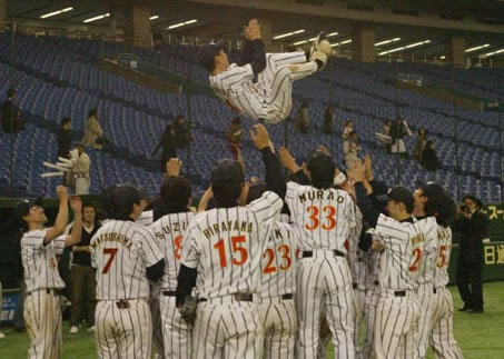 ケンコーポは3回、この回先頭の9番・中村から1番・朝日、2番・大原が3連続死四球を選び好機を作り、ここで代わった平山投手からも3番・尾関が押し出し四球を選び1点を返し、4番・渡辺の内野ゴロで1点を追加したが、後続を断たれた。 4回にも、敵失と大原の内野安打などで2点を返したが、序盤の大量失点が堪えた。 先発の中村、2番手の笠とも制球力を欠いた。2人で4回まで7安打を浴び、 11 死四球を与えたのが誤算。3番手で登板した新人の小笠原が最終回を3者凡退に切って取ったのが収穫だった。元オリックスの庄司の出番はなかった。 ○鈴木監督 点数以上に苦しい展開だった。これまで今野様々だったが、今日は打線がよく打った。相手投手は前試合を見ていたので、傾向は把握していた。全選手でその情報を共有したが、その通りの結果になった。水曜ブロックのレベルの高さを示せたのでよかった ○今野投手 最初から肩に違和感があった。3回からはしびれてどうしようもなかった。こんなの初めての経験 ○山本捕手 相手投手の研究? 僕は、前試合をただ見ただけ。何もしてませんよ(笑) ○堀井氏 北寒寺はすごい球を投げるし、松島だって投げられる(4点を返された場面で) ○渡辺 みんなよく打った。これまで今野に迷惑をかけてきたので、少しはお返しができた(今季で主将を返上するそうだが、前試合に続き2安打3打点の活躍) ○佐藤盛 やっぱり結婚したのがよかった(この日も1安打1打点の活躍) ○平山 調子? 勝てばいいんです。登板は監督から「あるかも」と言われていました ●田辺監督 しょうがない。投手がつぶれてしまった。いきなり連続死球では…。よく打たれたね。でも毎年、ここまで来ているのだから…。また頑張る ●笠 つらい…。みんなに楽しんでもらおうと思ったが… ●渡辺 今日は小笠原だけ(打点1ながら3タコで) ●大原 残念会? 明日は仕事だからこれで解散 ●小笠原 先発? 先輩に負けないよう頑張ります(日大三高−国士舘卒の新人) ●村井氏 辛い。いゃぁ…(応援では大口を叩いていたが、敗戦後はしょんぼり) 旭化成・北寒寺 プロ級の超美技を再三披露 旭化成ホームズ北寒寺選手 旭化成・北寒寺遊撃手が超美技を再三披露。守備だけならプロでも十分通用する技量の持ち主であることを証明した。 最初は1回の守り。ケン朝日の三遊間の当たりを3塁手が後逸、バックアップした北寒寺は矢のような送球を送った。その球を 1 塁手が後逸したためアウトを取れなかったが(記録は1塁手の失策)、タイミング的には完全に内野安打だった当たりだった。 4回にも魅せた。大原の難しいゴロを裁き、ワンバウンドで送球したが、1塁手が後逸。記録は内野安打と遊撃手の失策となったが、普通の1塁手なら難なく捕球していた球だった。 選手、観客を魅了したのはこの後だった。尾関の左翼前安打と思われた飛球をダイビングキャッチし、追加点を阻んだ場面だ。超美技に敵味方がうなった。 本人は、失策したことが悔しそうで「取れない球を投げた僕が悪い」と反省していた。 「誕生日祝い たまにはいいものだ」ケンコーポ田中社長 奥さんから花束を贈られる田中社長 試合前、激励にベンチを訪ねる田中社長と奥さん。隣が田辺監督 ケンコーポ田中健介社長は、この日が69回目の誕生日。奥さんと一緒に応援しつづけたが、結果は残念ながら敗戦。試合後は第三企画・久米信廣代表の粋な計らいでセレモニーが行われ、「誕生日祝いなど最近は忘れていたが、たまにはいいものだ」と嬉しそうだった。