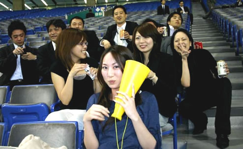 女性から好かれる両チームの選手(羨ましい) 左はケンコーポ尾関選手の応援団「尾関選手は独身? 」「いえ、子どもが1人います。でも、関係ないんです」 右は旭化成ホームズ所沢営業所の応援団「宮本さんと山本さんの応援です。みんな家族のようなものです」